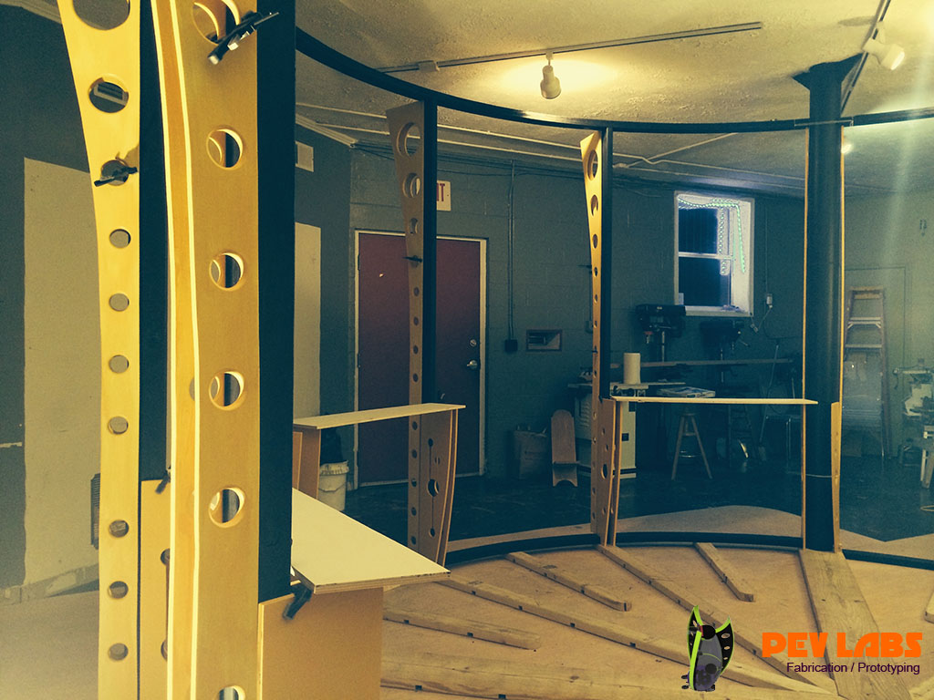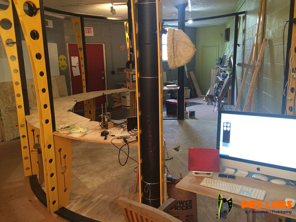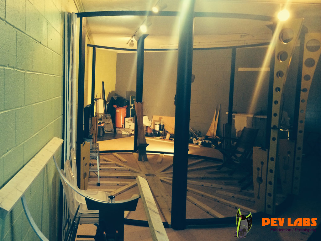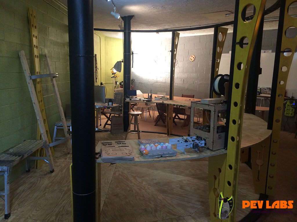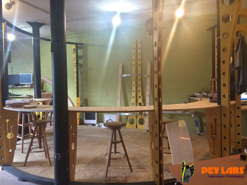 The Circumference of the Nine Apostles was a circular room we built in the original Tinkersmiths Makerspace. Possibly the second tactile related set of workshops as many of the first members had carpentry skills. This commercial property was only 700 square feet and triangular in shape, which left little room do a cool setup. We we came up with was a circular wall/ room with the outer edge being a series of workstations, nine of them, hence part of the name. The original intent was to wrap the curved walls with clear polycarbonate but we outgrew the space so quickly it never got finished. This was made with a few power tools, long before we dreamed of making our first CNC machine. No planning or design was done ahead of time in the computer, or actually done at all. We simply just measured, cut, attached then repeated. This project was loads of fun and loved by many.