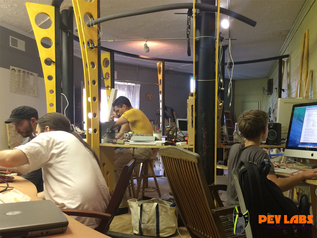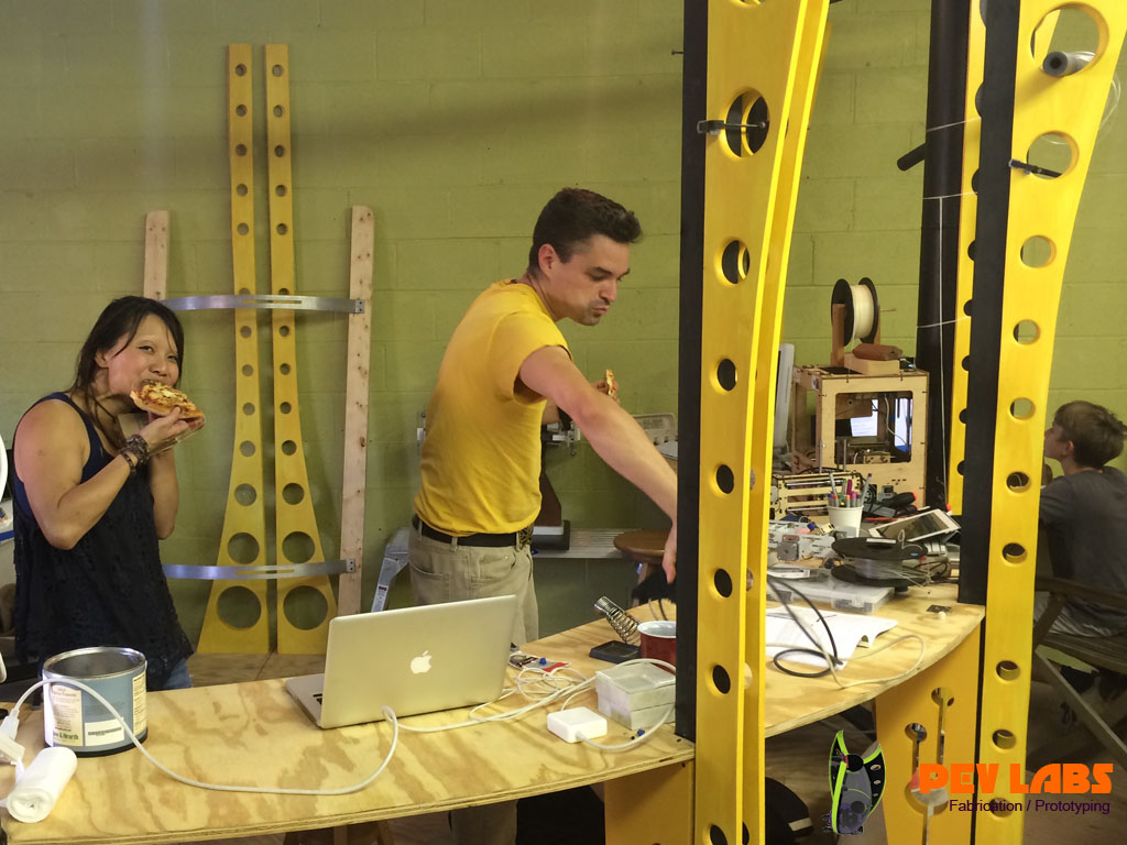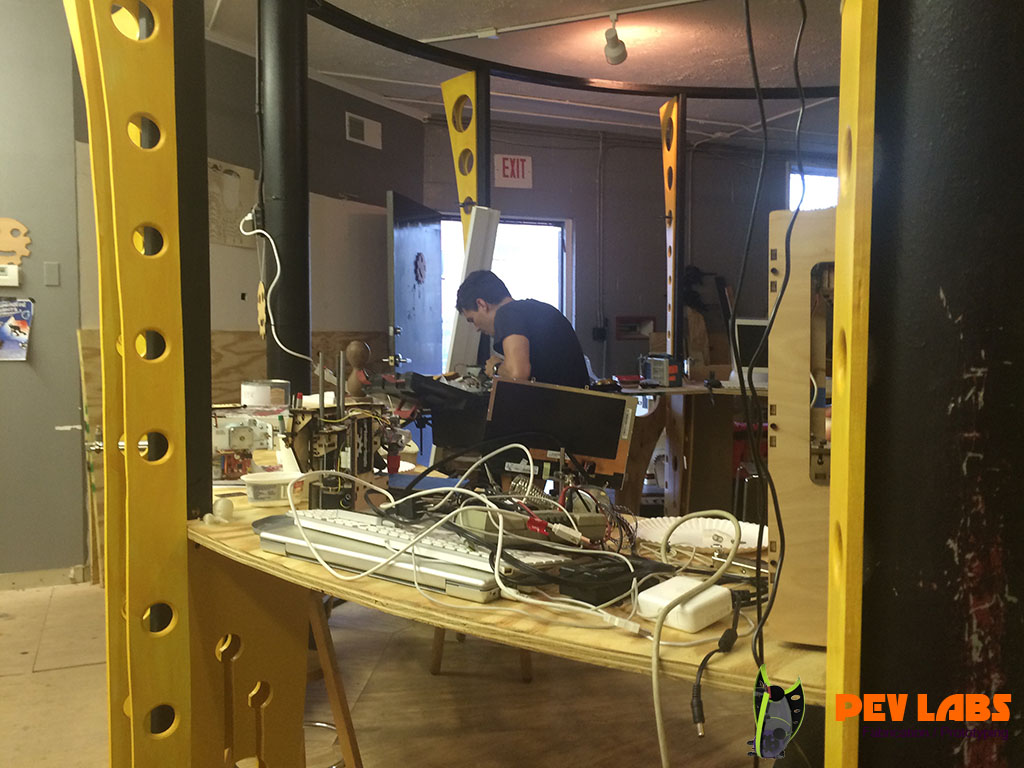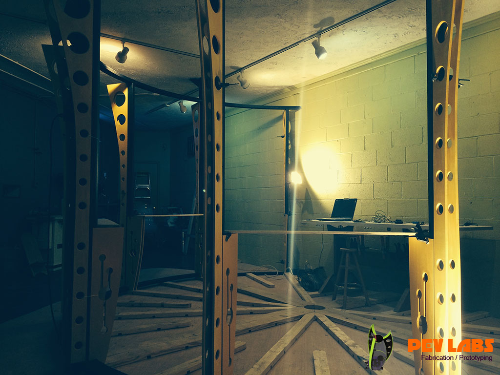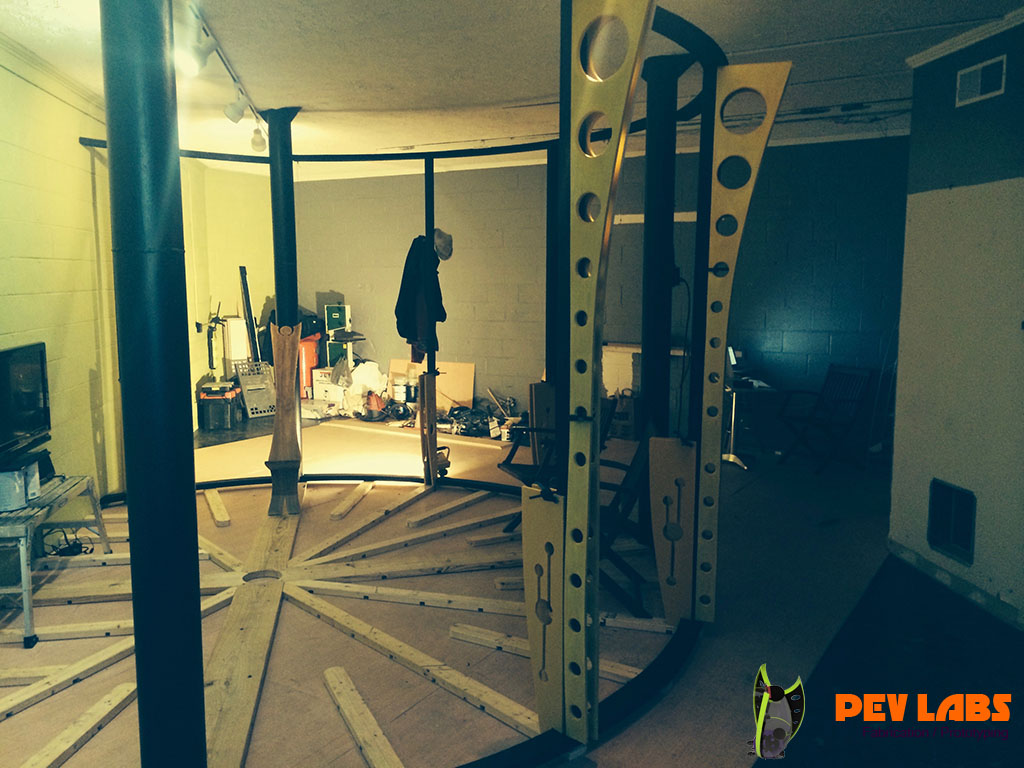 The Circumference of the Nine Apostles was a circular room we built in the original Tinkersmiths Makerspace. Possibly the second tactile related set of workshops as many of the first members had carpentry skills. This commercial property was only 700 square feet and triangular in shape, which left little room do a cool setup. We we came up with was a circular wall/ room with the outer edge being a series of workstations, nine of them, hence part of the name. The original intent was to wrap the curved walls with clear polycarbonate but we outgrew the space so quickly it never got finished. This was made with a few power tools, long before we dreamed of making our first CNC machine. No planning or design was done ahead of time in the computer, or actually done at all. We simply just measured, cut, attached then repeated. This project was loads of fun and loved by many.