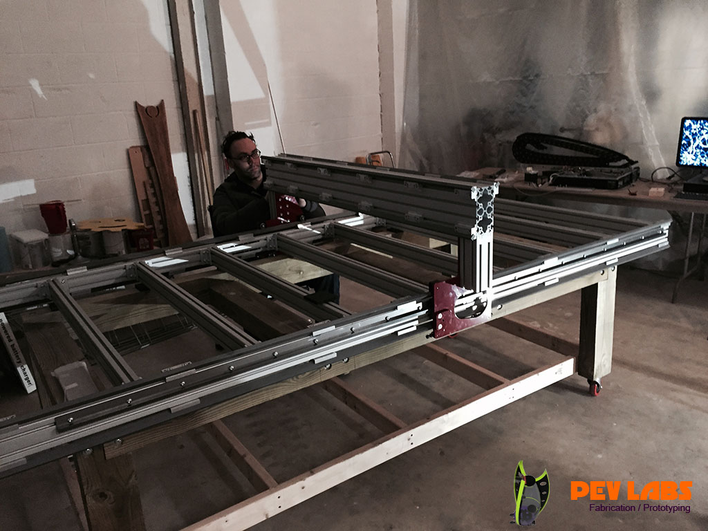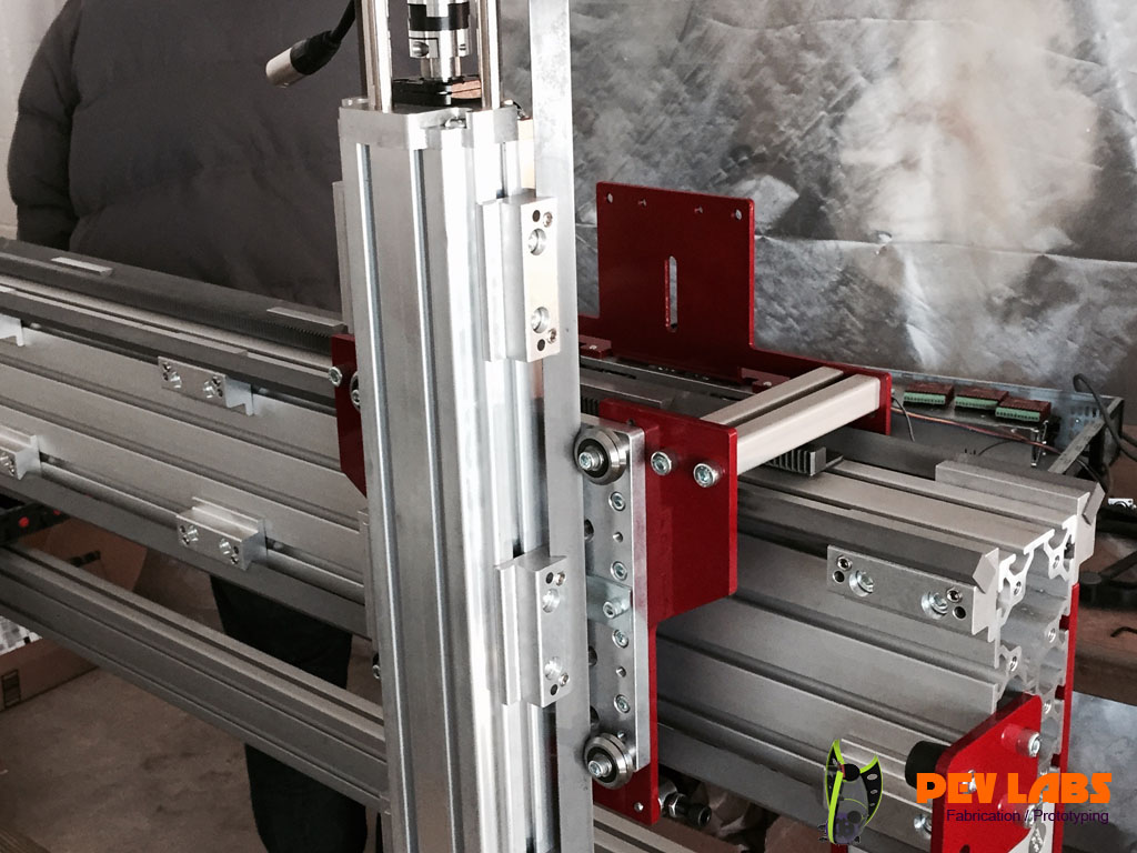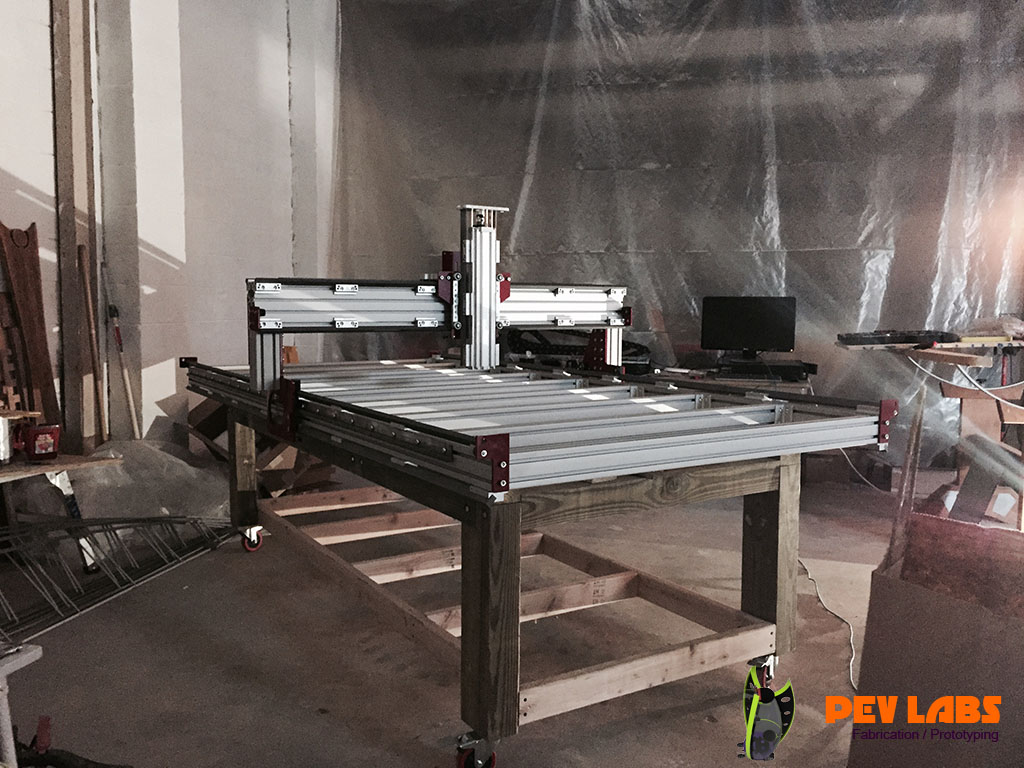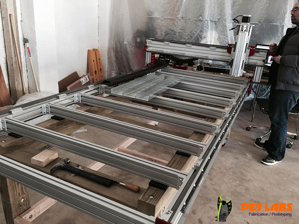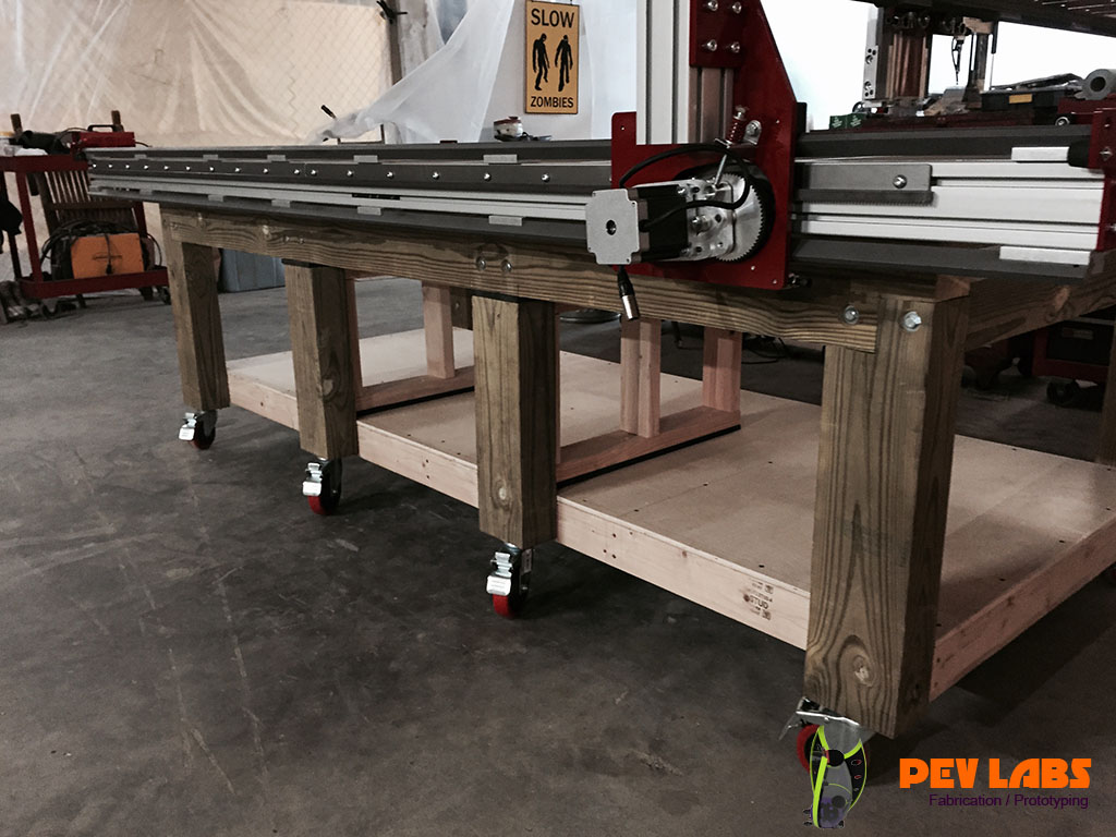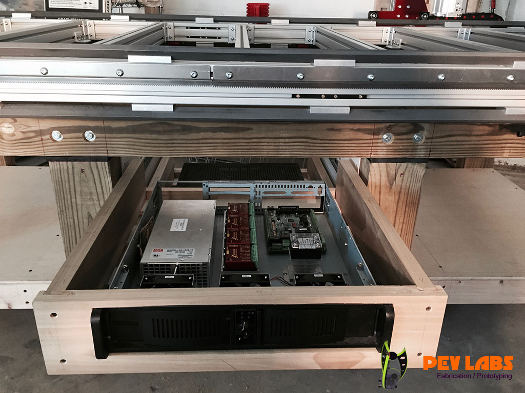 We design and build custom manufacturing machines. This is the build page for our 48" x 96" gantry style router has been going strong daily for nine years. Currently we are in the process of our 90 Watt CO2 laser build which you can follow here. This is our build page for large format 4'x8' gantry style CNC routing machine we made at Tinkersmiths Makerspace. Digital fabrication is the heartbeat of our CNC service offerings and Digital Fabrication Services.Powerful NEMA 34 stepper motors makes this thing a total workhorse. Five horse power, 2.2KW 220 volt spindle runs from 8000 to 24000 RPM. Custom electronics along with custom post processor coding in the open source Linux CNC software running on a custom made computer. Designing and building motion control systems is a favorite of ours. Originally built in 2016 this CNC machine is still the heart of our digital fabrication business today. Recently (2019) upgraded to a water cooled spindle. We are in the process of designing our vacuum table system along with a fourth axis. If you would like a custom CNC machine built for you please contact us.
