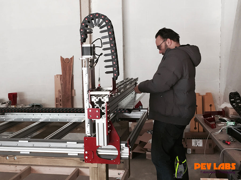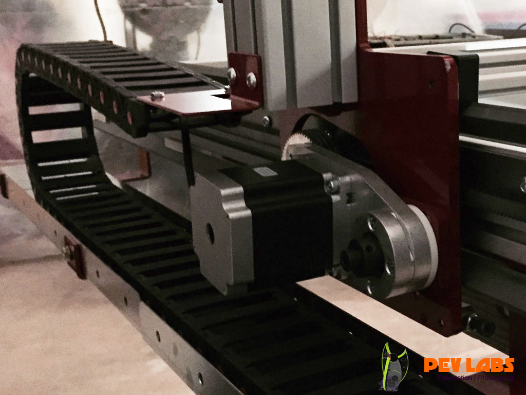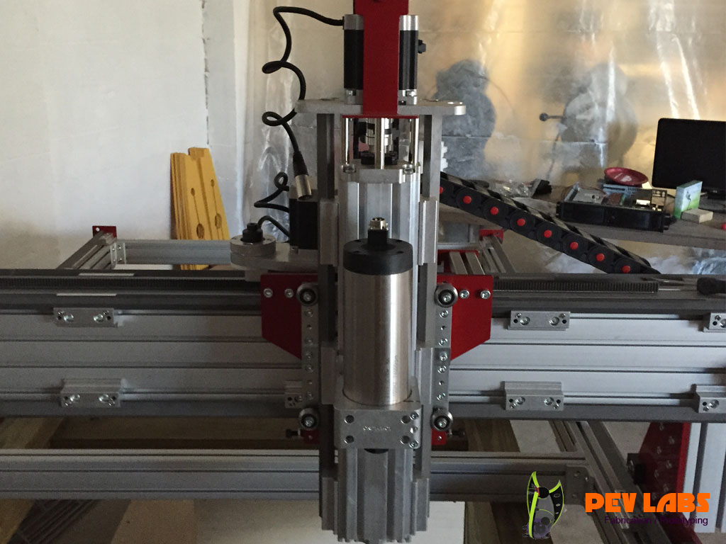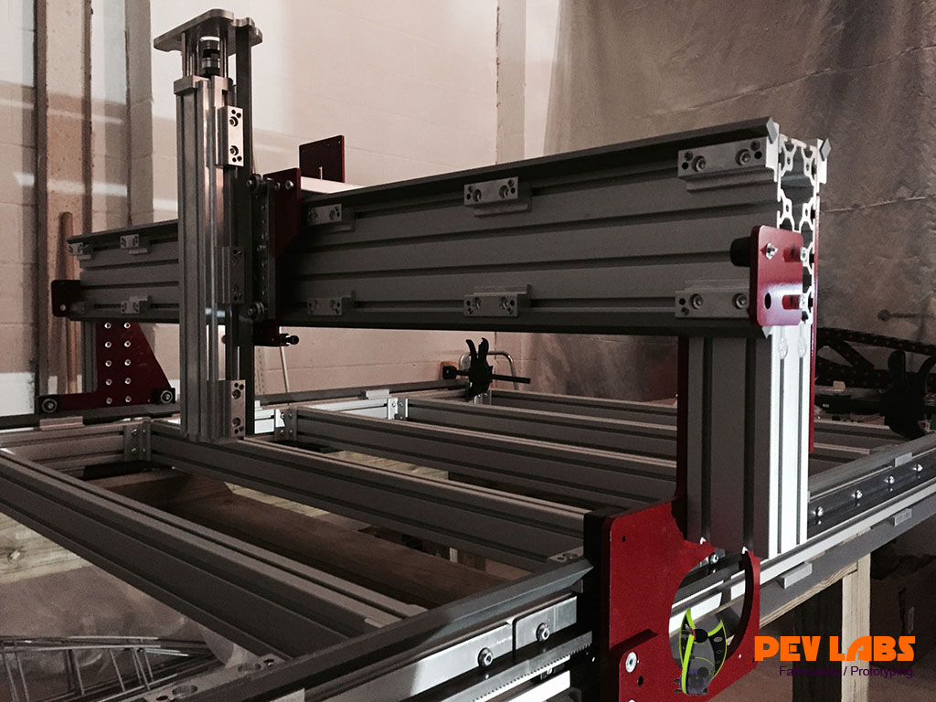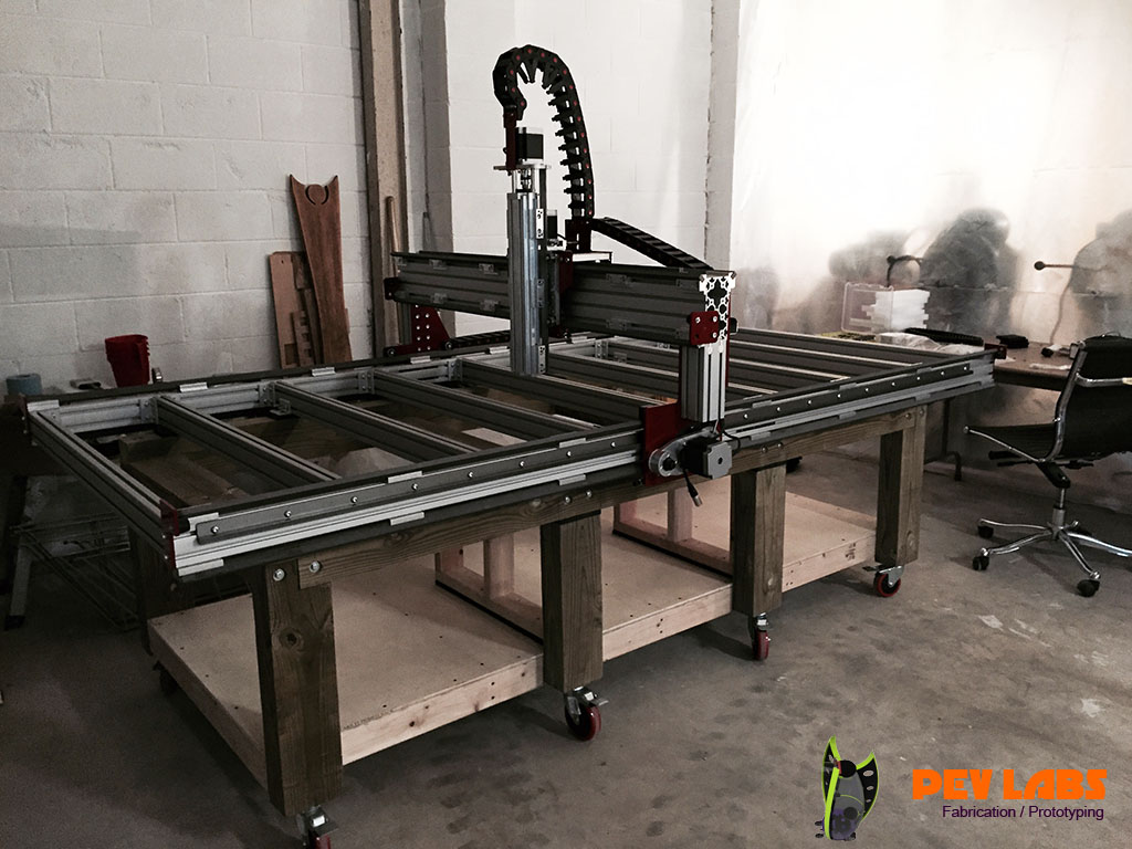 We design and build custom manufacturing machines. This is the build page for our 48" x 96" gantry style router has been going strong daily for nine years. Currently we are in the process of our 90 Watt CO2 laser build which you can follow here. This is our build page for large format 4'x8' gantry style CNC routing machine we made at Tinkersmiths Makerspace. Digital fabrication is the heartbeat of our CNC service offerings and Digital Fabrication Services.Powerful NEMA 34 stepper motors makes this thing a total workhorse. Five horse power, 2.2KW 220 volt spindle runs from 8000 to 24000 RPM. Custom electronics along with custom post processor coding in the open source Linux CNC software running on a custom made computer. Designing and building motion control systems is a favorite of ours. Originally built in 2016 this CNC machine is still the heart of our digital fabrication business today. Recently (2019) upgraded to a water cooled spindle. We are in the process of designing our vacuum table system along with a fourth axis. If you would like a custom CNC machine built for you please contact us.