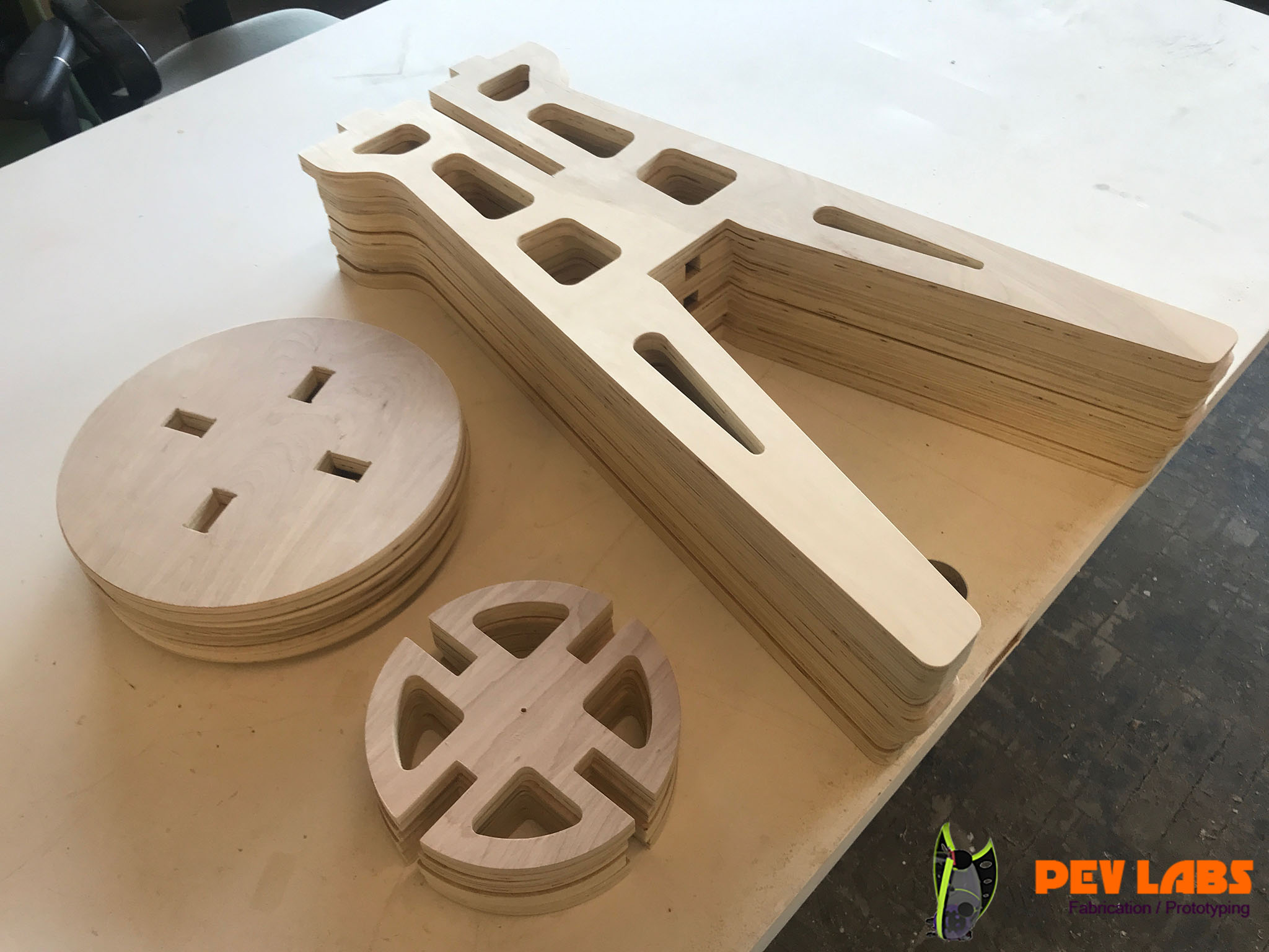 CNC milling parts for professional and personal projects. We can machine flat stock and three dimensional complex shapes. Send along STEP files, DWG, DXF or SVG files to scale along with the material type and shipping zip code if you would like to explore having us cut material. Various services for milling hardwoods and milling plywoods to make things or parts for the projects you make. The CNC is also a wonderful tool for producing templates, forms and jigs. Parts can also be milled from plastic. Mechanical parts can be fabricated from metals though we mostly work in non-ferrous metals as they machine about the same way with the same equipment as other materials. If you need heavy steel stock or steel sheet goods milled we do not have a plasma-cutter or water jet at this time.