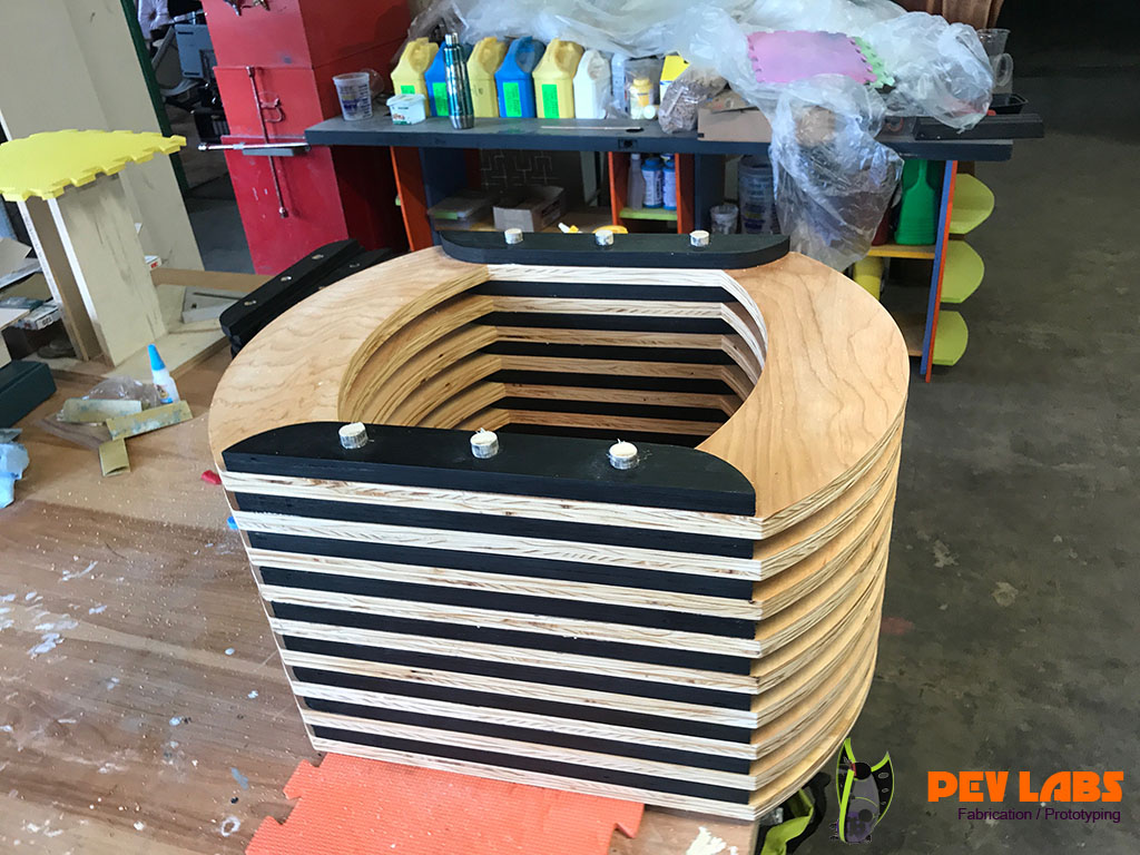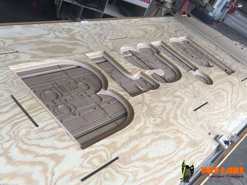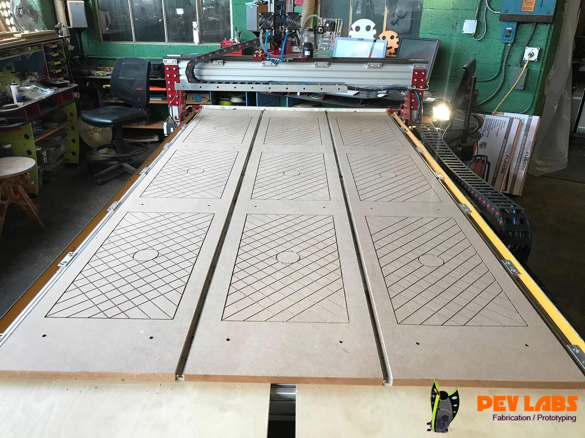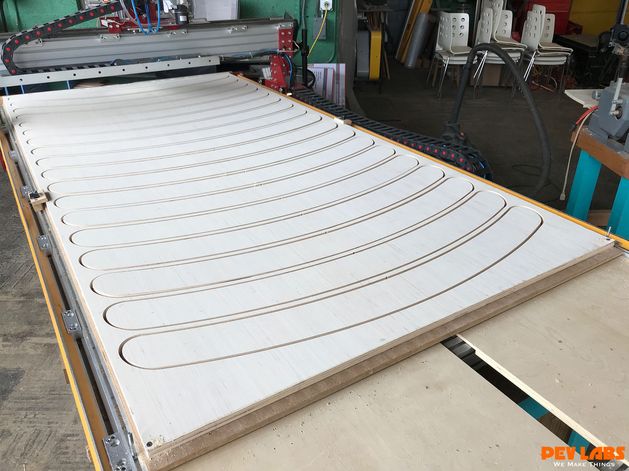 PEV Labs offers CNC Milling Services of plywood sheet material for professional, educational and personal projects. Milled plywood is useful for commercial displays, cabinetry casework, flat pack furniture products, jigs, forms, prototyping, mock-ups, mold making for resin or composite casting and concrete molds. We frequently mill plywood for our flat pack furniture line along with many of the work surfaces in our workshop. Common plywood species are pre-primed paint grade, bamboo, cherry veneer, walnut veneer, oak veneer and luan underlayment. Plywood is a fairly cost effect material to work with and easy to obtain of short notice. Typically supplied in 48" x 96" but some specialty cabinet material suppliers will offer 49" x 97" to account for the material loss from saw kerfs and end mills. Thicknesses are 0.25", 0.0375", 0.50", 0.75" and 1.0". More about plywood basics and costing here. Our CNC milling skills serve Charlottesville, Waynesboro, Staunton and Virginia on two major trucking routes which offer excellent fleet shipping access. Loading Dock accessible.