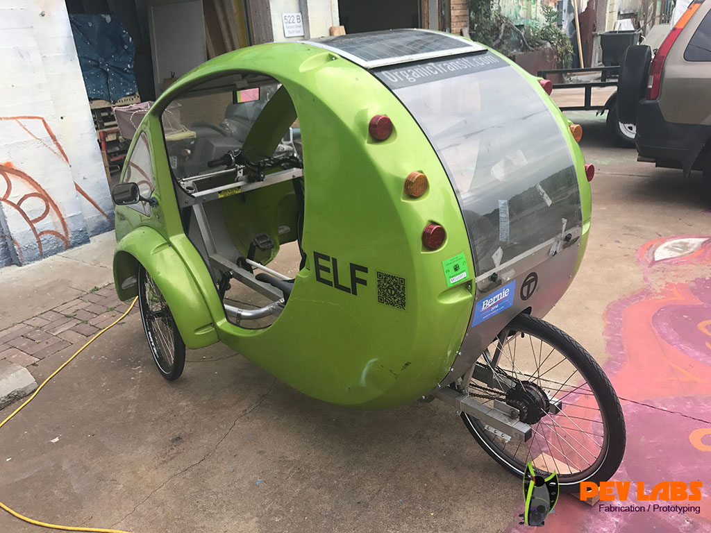 We have replaced the main controller circuitry and solar panel on Donna Carty's Elf shown below. Along with smaller body repairs along the way. The Elf is made by Organic Transit in Durham North Carolina. We have found the many small PEV manufactures offer interesting and useful products, but as small companies they don't have repair service stations outside their main facility. PEV Labs is always eager to work on something we have not seen before. Check our some PEV's, or personal electric vehicles we have designed and built. Please contact us if you have something that moves which could use a little help.