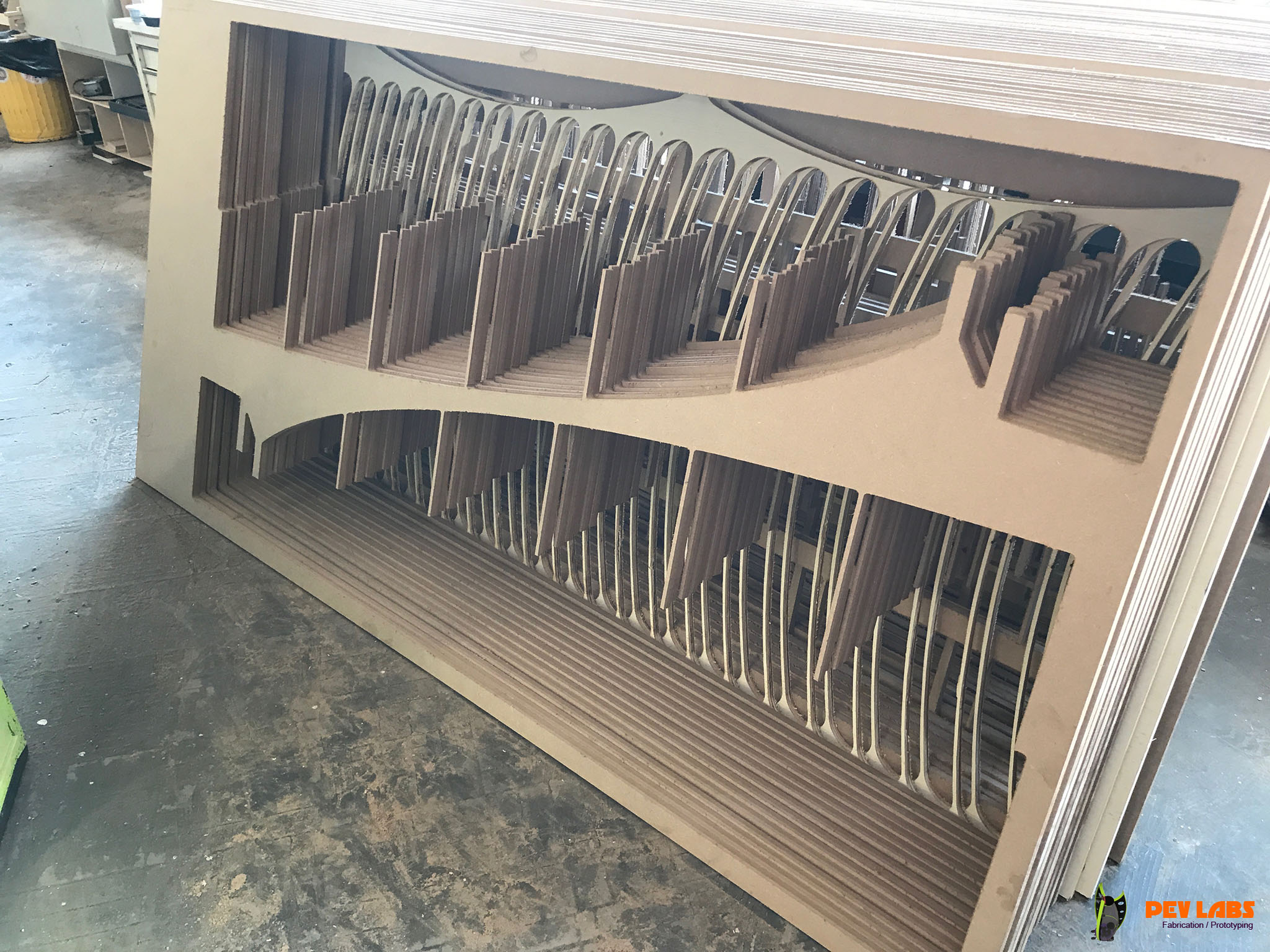 We utilize MDF here for cabinetry, kiosks, displays, signs, mold making, forms, jigs, templates and probably a hundred other fabrication milling tasks. MDF is a common panel material which mills nicely on the CNC Router. CNC Machining MDF works well for flat sheet stock and more complex contouring for decorative panels or architectural topography maps. Most often milled with digital milling equipment but with a basic electric router for edge round overs. A high-Z CNC can be used when laminating multiple layers of MDF for make larger panels or parts. Industries such as advertising rely on MDF or MDF Composites with a finish outer layer for displays and signage where a 3D effect is desired. Tricoya MDF is very durable and moisture resistant which makes for a wood alternative in outdoor use. Audio hobbyist will use MDF for speaker cabinet enclosures. Here are a few example milling runs of this material below. One is for a Color-Core MDF kiosk prototype. Another is a Waffle Structure for a large scale parametric concrete form.