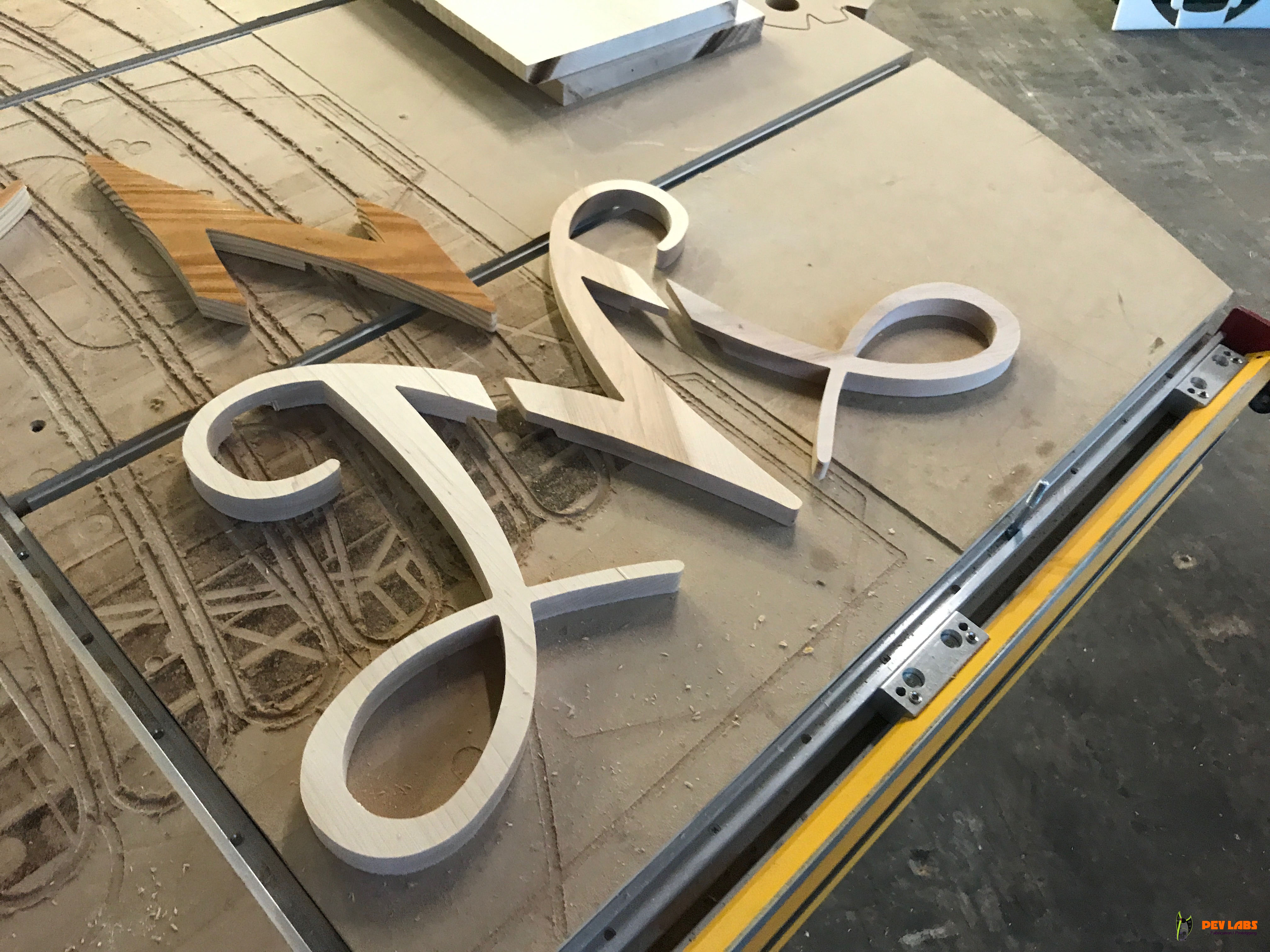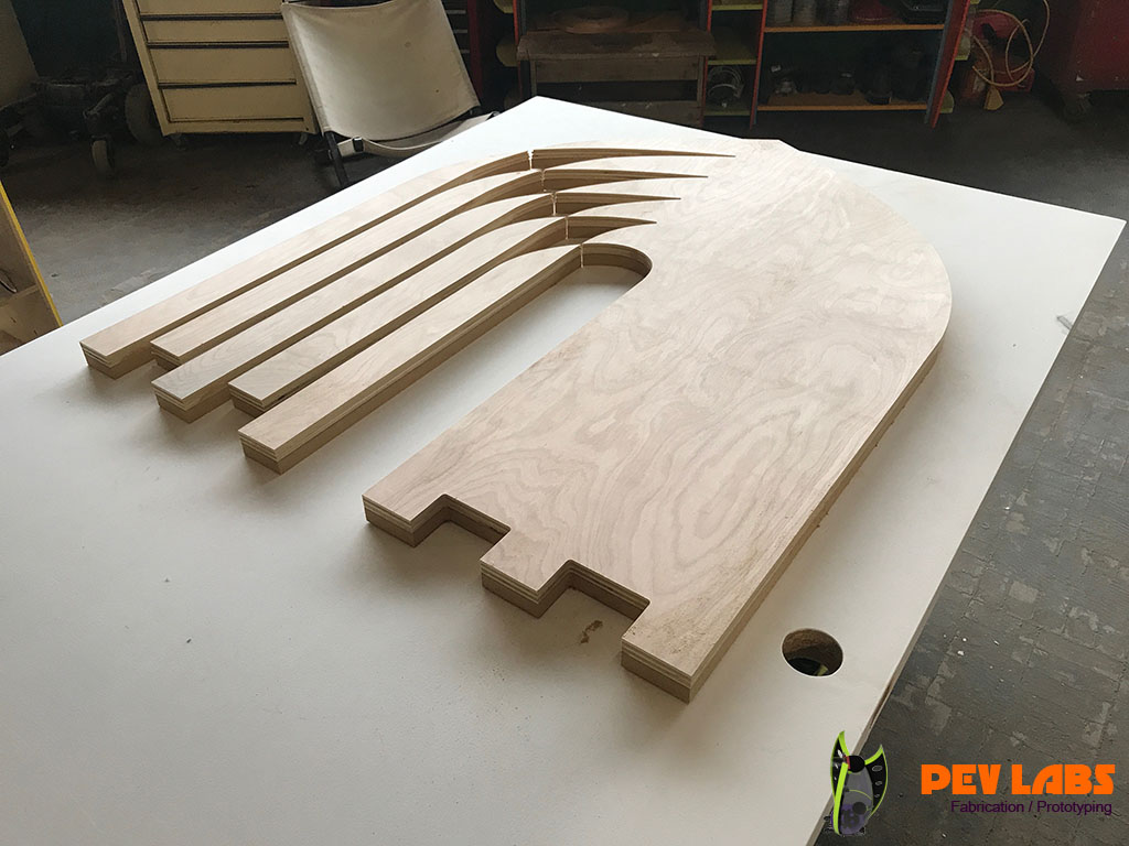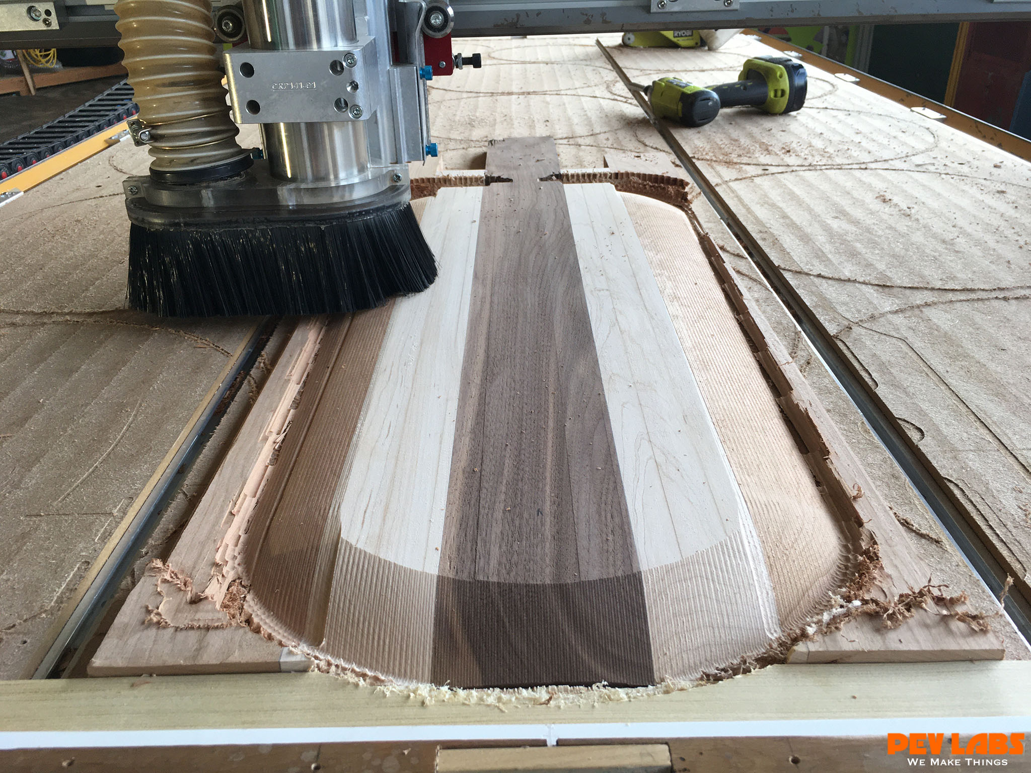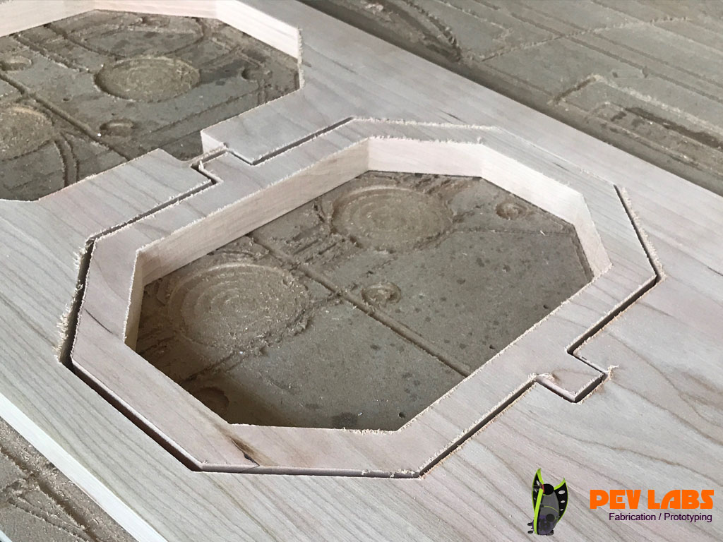Milling wood of varying types and species is a common task we do both for our client contracts and for other craftspersons needed to increase production capacity. PEV Labs handles woodworking projects digitally with our Computer Numeric Controlled gantry based router and with traditional machinery such as table saw, bandsaw, shaper, router table, etc. Wood types range from plywood stock, both pre-finished and paint grade to locally harvested hardwoods. Common milling run tasks in plywood sheet for flatpack furniture, templates and jigs. Solid woods most often are walnut, cherry, maple. Imported lumber such as mahogany and Sapelli are fine. There is a well known antiquated timber supplier right next door if you want to add texture to a project. More complex wooden projects might make use of embossed objects such as brand logos, project boxes for electronic components and architectural objects. Engraving with resin fill is fun too.