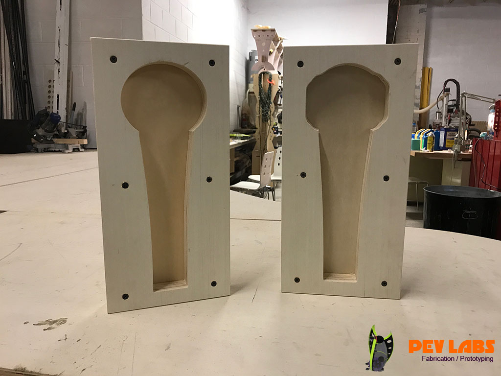 PEV Labs designed and manufactured a small run quantity of 25 resin cast beer tap handles for the Pro Re Nata Farm Brewery in Crozet Virginia. We designed them in AutoDesk Fusion 360. Fusion was also used to create the 3D model .stl file needed for the 3D Print used for casting. We loaded the STL into our Ultimaker 2 3D printer where we printed two different style master handles to be shown to client. Even though we were only to produce one style we sanded and primed with auto body primer both designs models. They were hot glued to a piece of plywood and formed up to make the silicon molds. Two part epoxy casting resin was mixed, degassed in a vacuum chamber and poured into the mold. This was repeated every half hour until we had 25 solid resin blanks. The indent on one side was in the mould but we had to CNC mill the other side to match. Resin mills up nicely. They were painted white. Chalk board sticker material was applied to the indents. Branding logos printed and applied to the head. Three coats of clear to seal the labels in so the would not come off in commercial use.