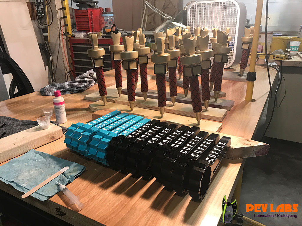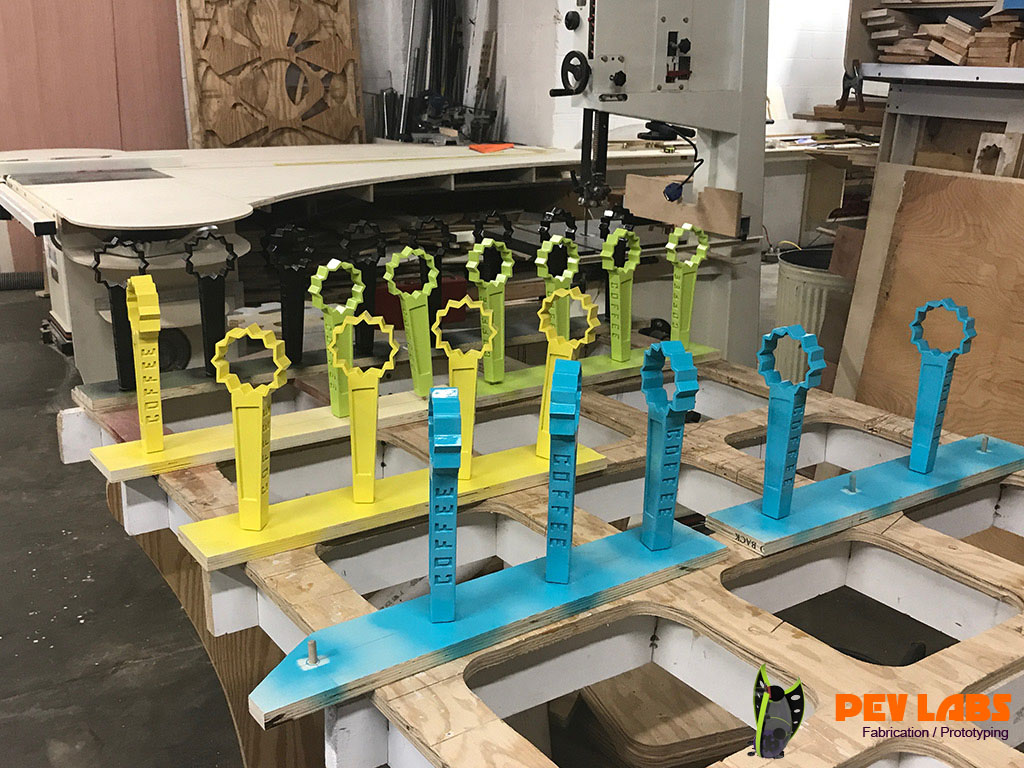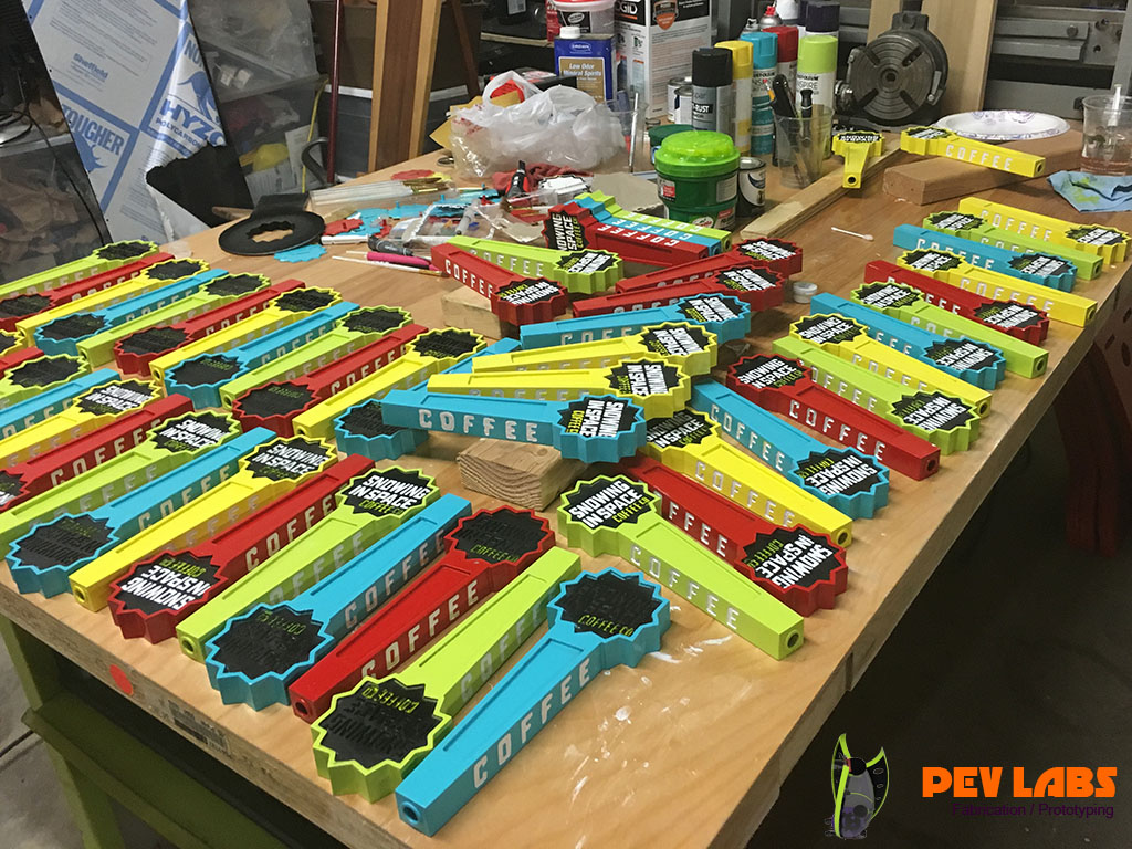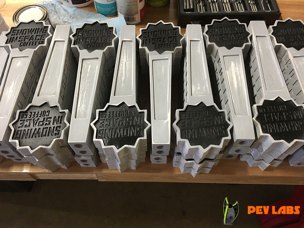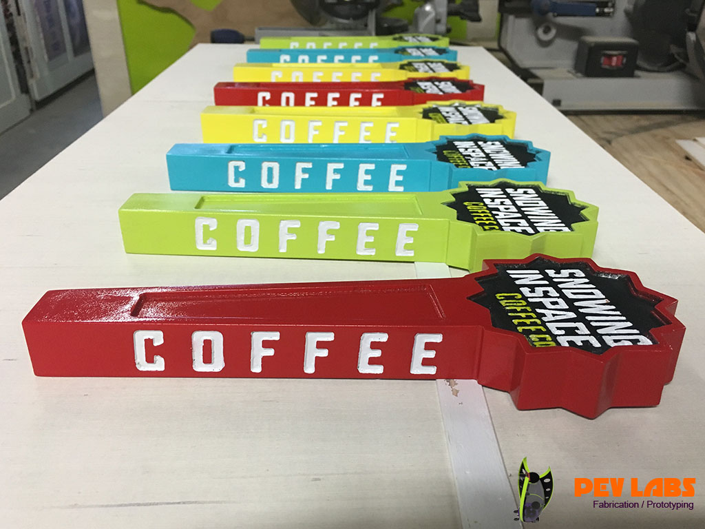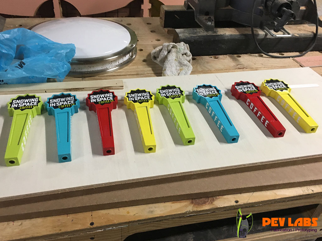 PEV Labs fabricated two production runs of these Snowing In Space beer tap handles. SIP is a Nitro Brewed Cold Coffee company. They offer in officer kegerator product as a service, along with on the shelf to to go. The business side utilizing kiosk dispensing allows employees and guess self serve which in turn require a custom tap handle much like brewery equipment dispensing. The First tap handle run was with CNC milled in sold 5/4 poplar. We made a jig to mill the face and letter engraving on the side of the tap handles. The second production run was resin cast, then fancy pants painted. Started with a 3D printed a master which we then made a silicon mold from. From the mold we cast 25 unit small run manufacturing in epoxy resin. The resin version require less sanding and less milling time.