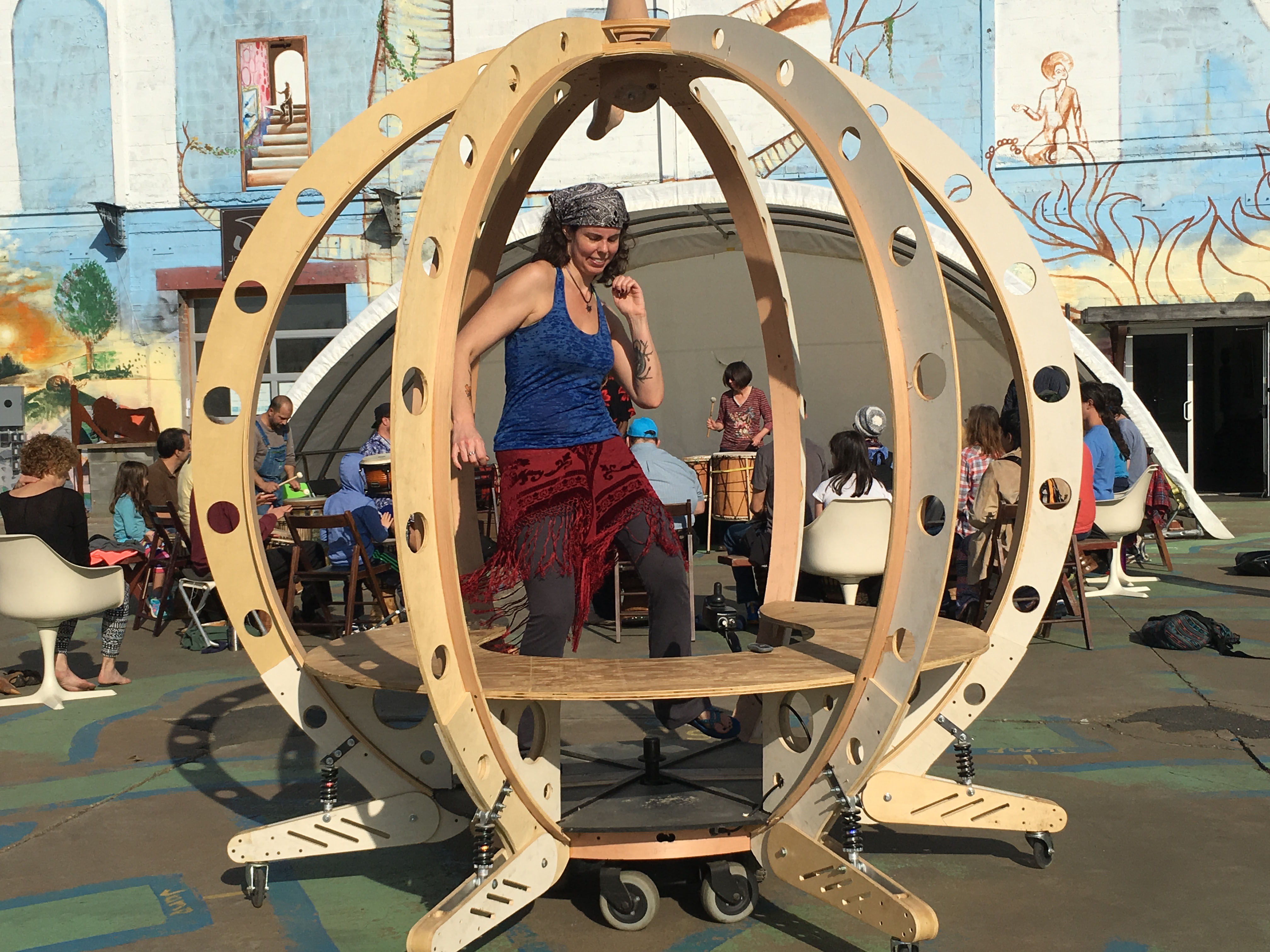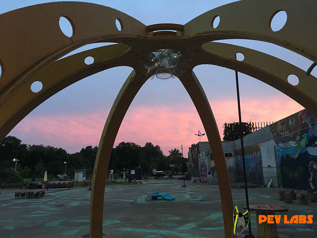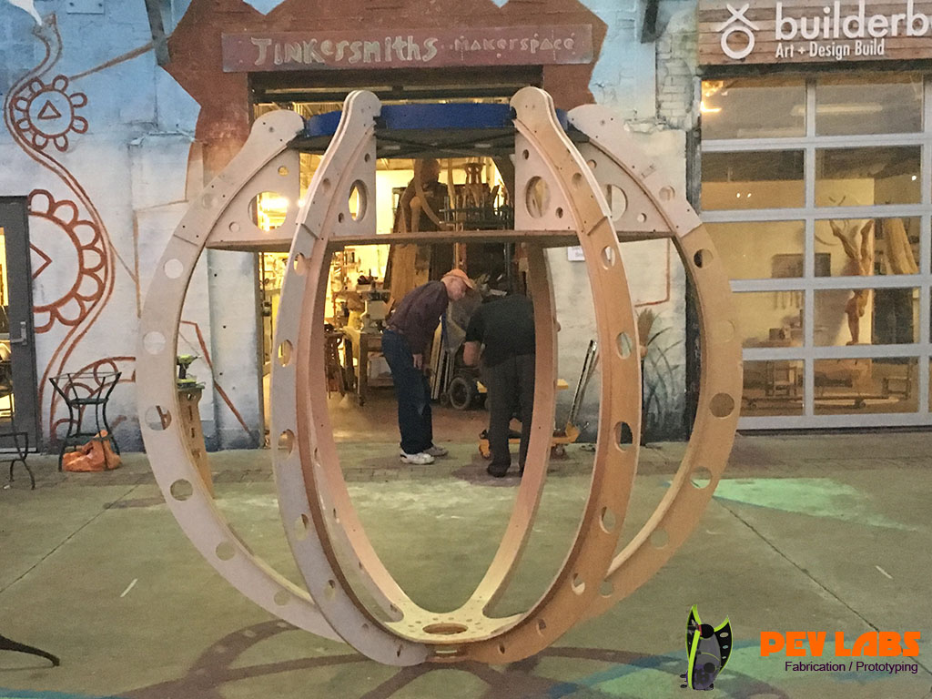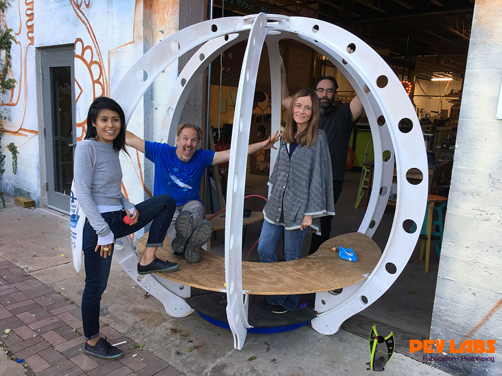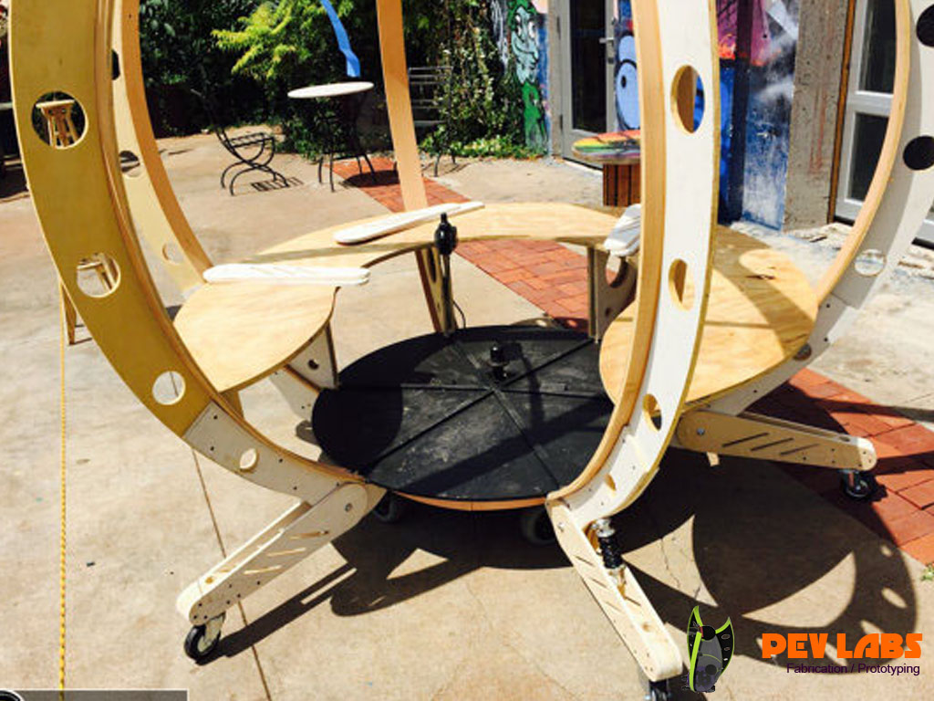 The Spherical Cubical Arc Reactor was in use at the IX Art Park in Charlottesville Virginia for several years. It held up surprisingly well for being made of two sheets of 1/2" plywood but would move around the weight of six adults. Originally unveiled at the IX Art Park during its first year with the Levitt Concert Series this was a hit of the concert goers wanting an immersive art experience. We offered rides during most of the concerts and other events during its tenure before being succeeded by the Dorkpod. The mechatronics component of the Spherical Cubical Arc Reactor has been decommissioned and the spaceship style bubble has been converted into a park bench. A second reengineered version is currently under production. They are rather large and not nearly as efficient for scooting around town which limits where we can use this. However they are super great fun for even venues or places with large open spaces. Runs about four hours on a full charge. Main Spherical Cubical Arc Reactor Video page. More about our whacky personal electric vehicles.
