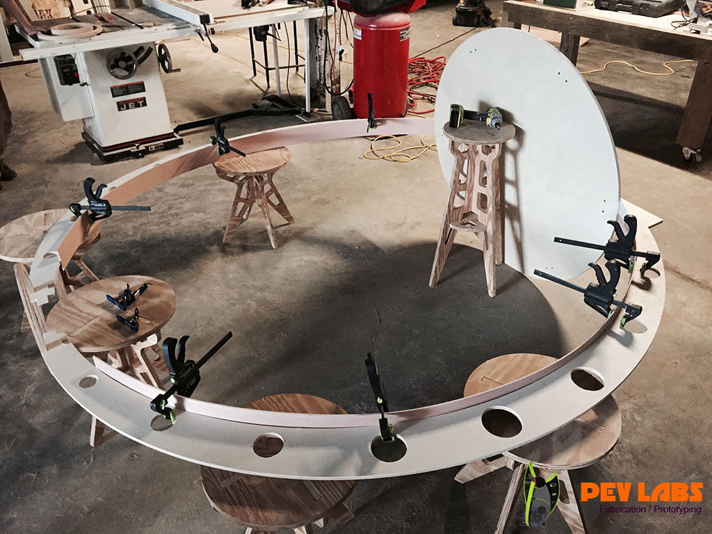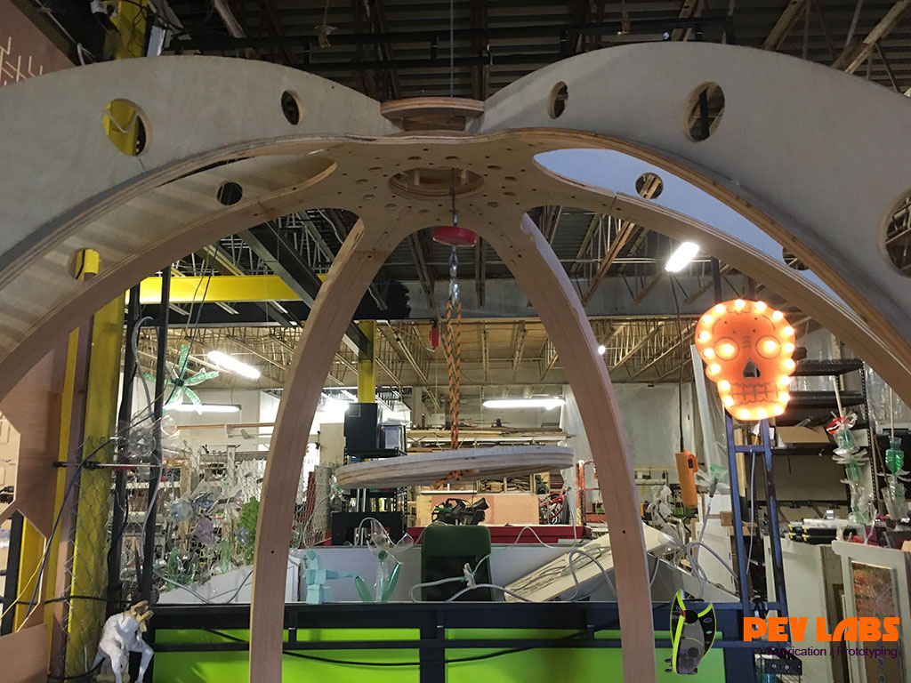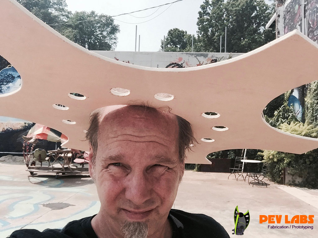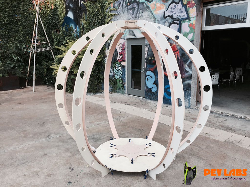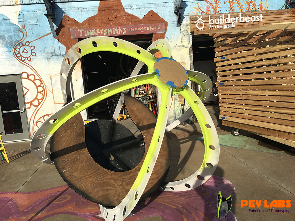 The Spherical Cubical Arc Reactor was in use at the IX Art Park in Charlottesville Virginia for several years. It held up surprisingly well for being made of two sheets of 1/2" plywood but would move around the weight of six adults. Originally unveiled at the IX Art Park during its first year with the Levitt Concert Series this was a hit of the concert goers wanting an immersive art experience. We offered rides during most of the concerts and other events during its tenure before being succeeded by the Dorkpod. The mechatronics component of the Spherical Cubical Arc Reactor has been decommissioned and the spaceship style bubble has been converted into a park bench. A second reengineered version is currently under production. They are rather large and not nearly as efficient for scooting around town which limits where we can use this. However they are super great fun for even venues or places with large open spaces. Runs about four hours on a full charge. Main Spherical Cubical Arc Reactor Video page. More about our whacky personal electric vehicles.
