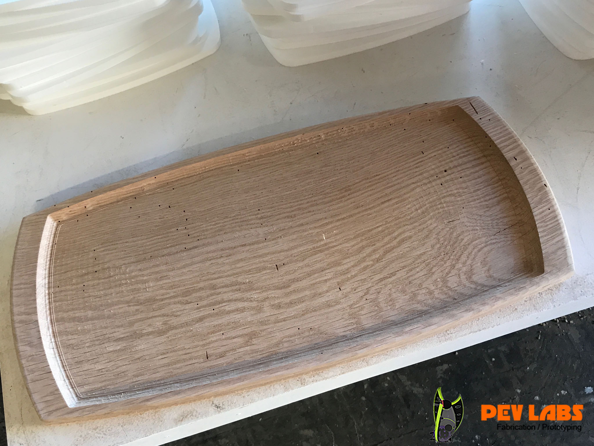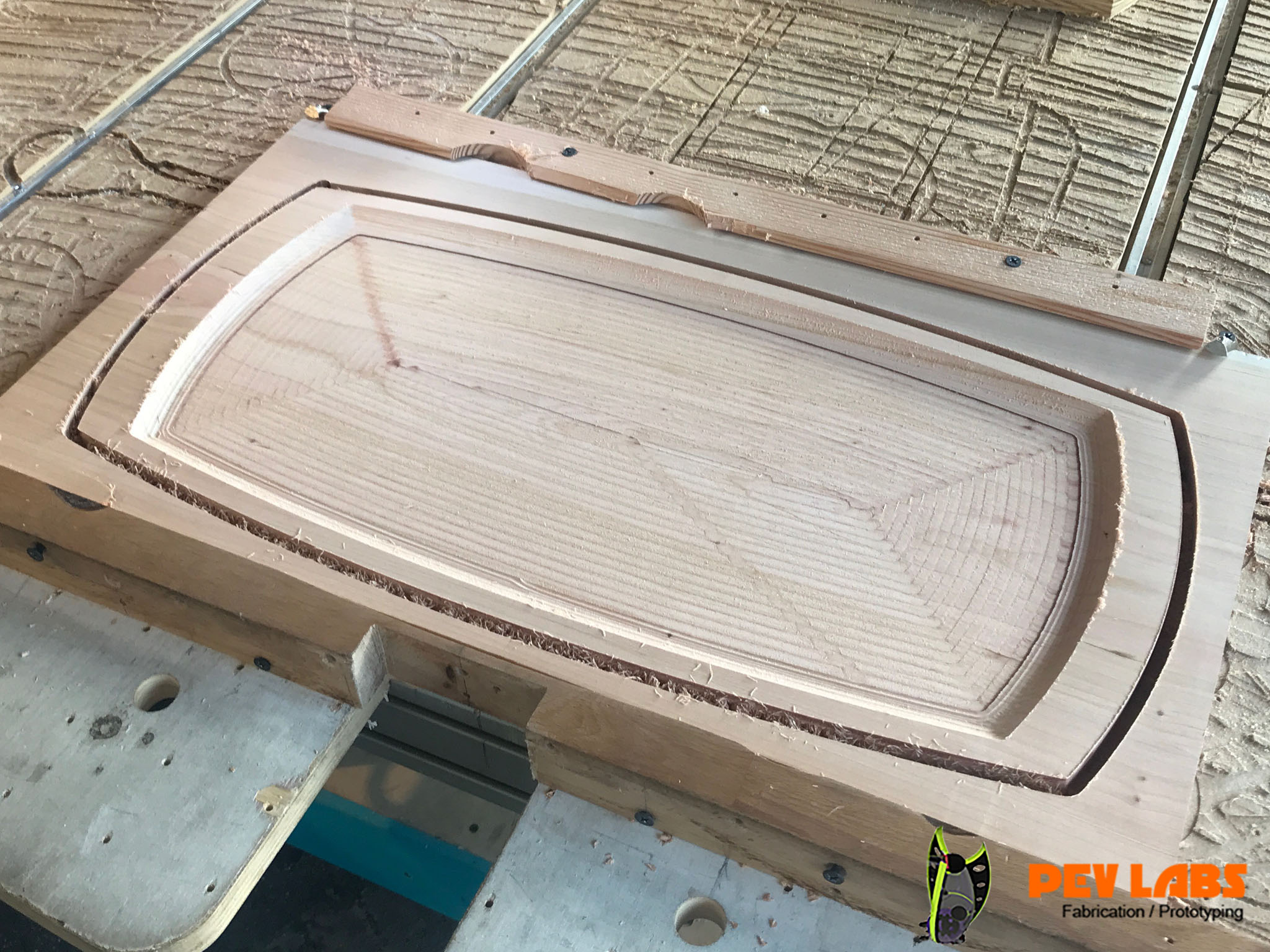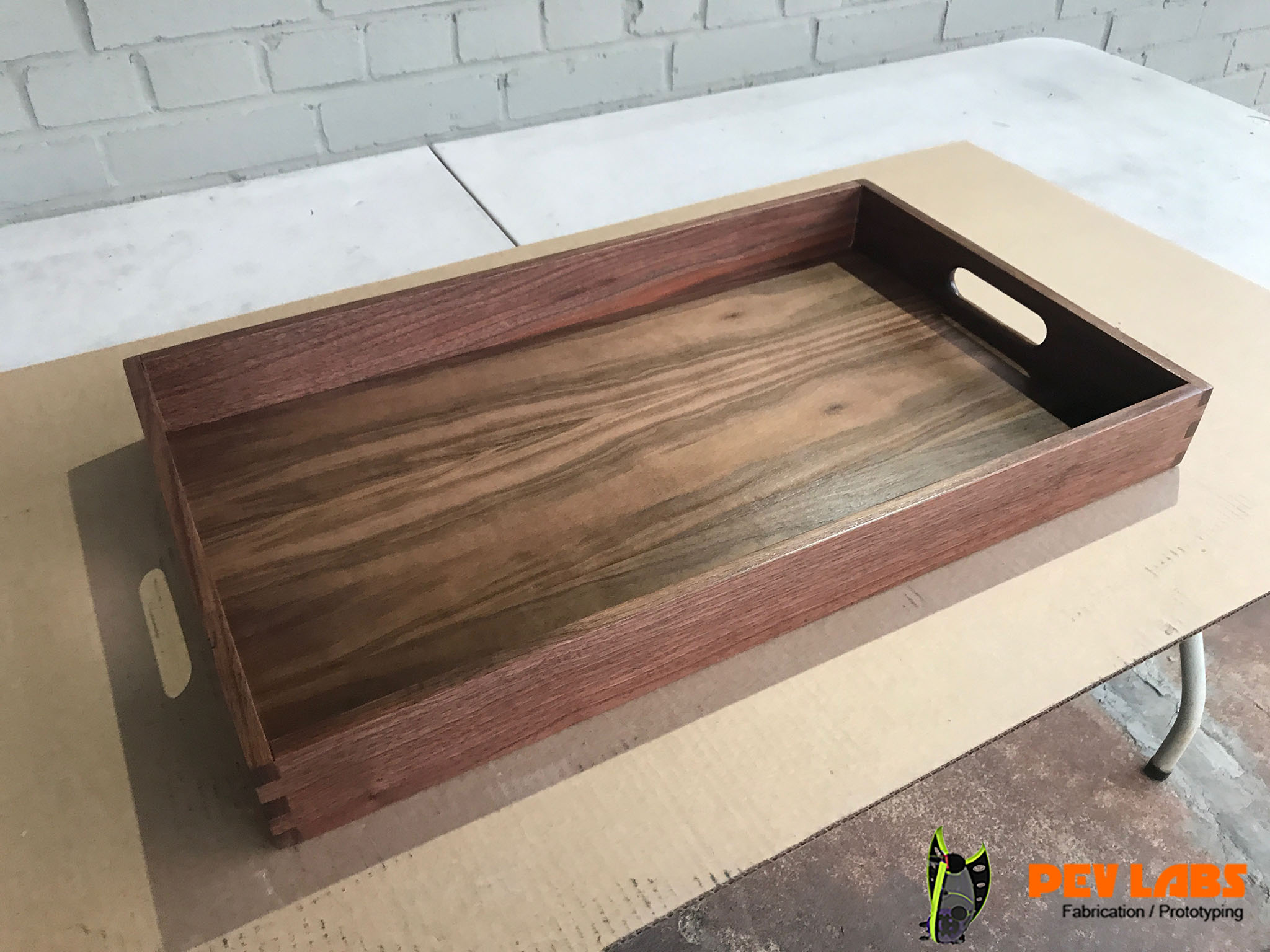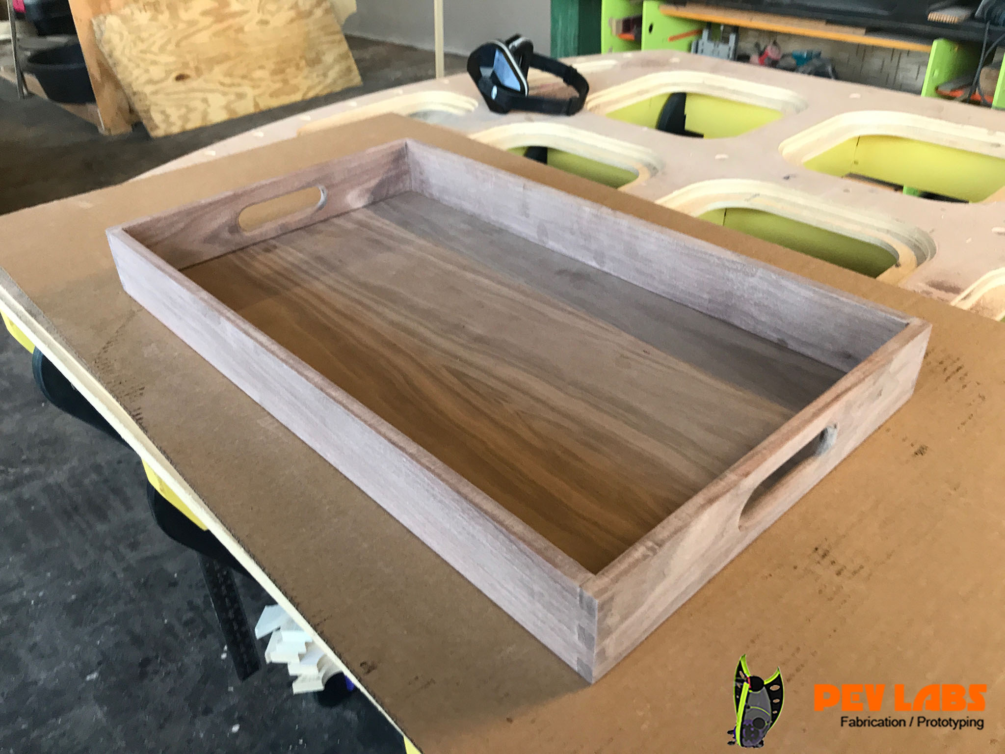Custom serving trays are a lovely way to augment the dining experience. We make custom trays with the material you prefer along with sizes that suit your needs. All of the trays here are for clients as part of their kitchen supply product base. Typical serving trays created for woodworking product vendors and venues. The box tray, which consists of solid hardwood sides which are utilized a box joint for strength along with a veneer plywood bottom. The bottom is locked into a groove that traverses the lower potion of the sides which keeps the bottom from falling out even when too much weight is inside the tray. The other being a solid hardwood plank which a recess is CNC milled with an inside cove around the inner edges. Wood species could be swapped out, or even changed to a more modern material such as HDPE plastic if desired for commercial applications. PEV Labs provides a verity of branded product offerings if you would like these with your company name, logo, etc. Trays shown here are made of walnut, cherry, maple and oak. If you would like custom serving trays made for your business, restaurant or hospitality venue in Charlottesville please contact us.